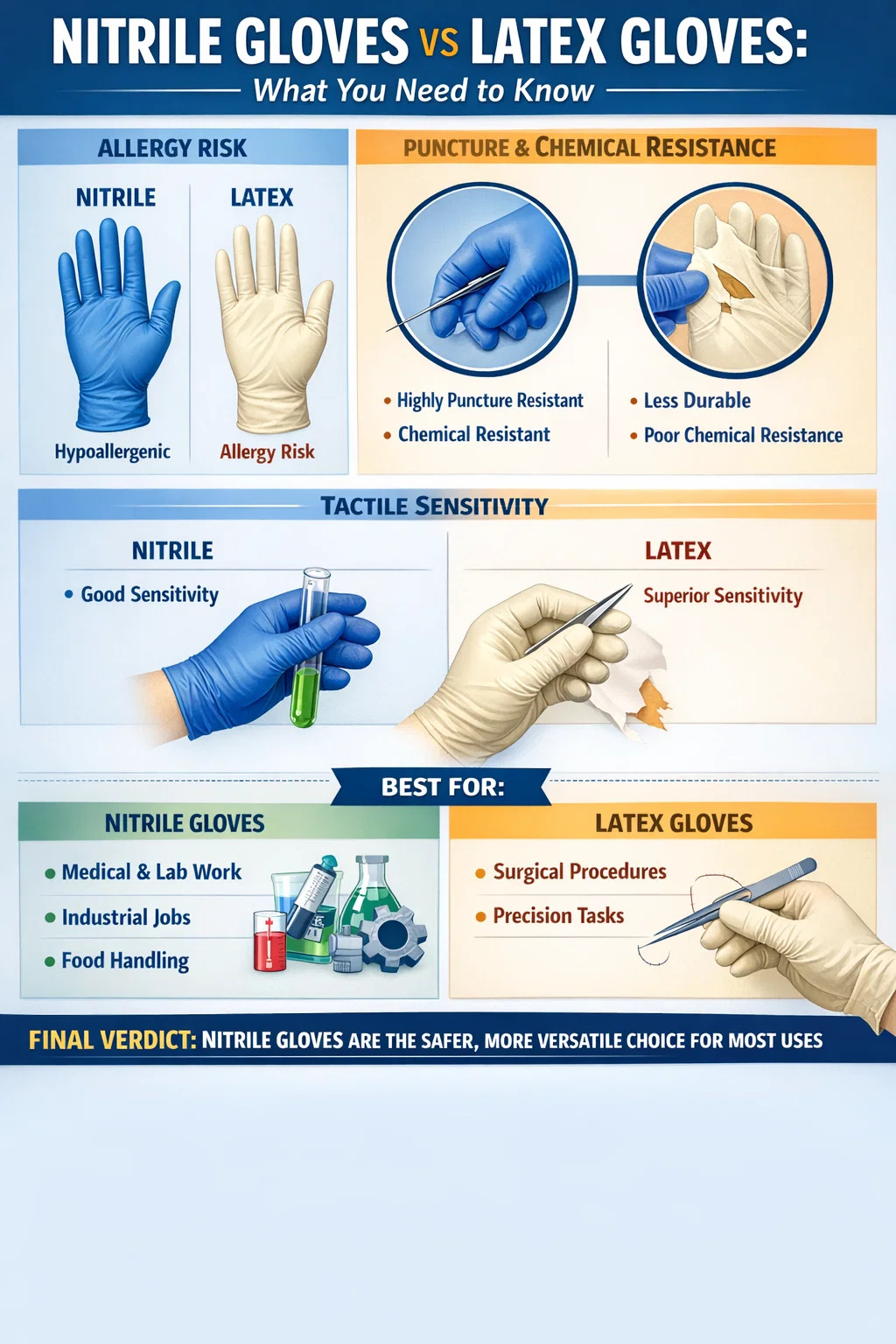 Quod dixit "tutius" ex contextu tuo pendet. Latex chirothecae adhuc significantes utilitates habent in sensibilitate et elasticitate tangendi, ut praeferantur in quibusdam fundis chirurgicis et delicatis processualibus. Propositum huius articuli differentias clare dissolvere potes, ut decisionem informatam in casu actuali tuo usui tuo, non in una magnitudine, omni commendatione possis facere.