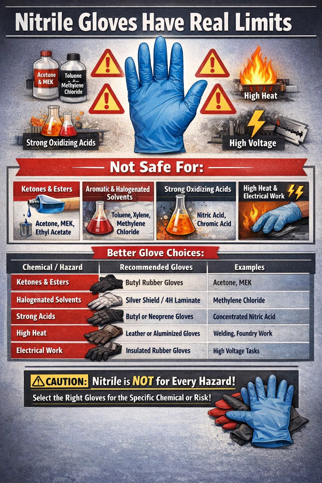 Nitrile factus est defectus chirothecae disponibilis in labs, occasus medicinae, processus cibi, opus automotivum, merito: resistit oleis, fomentis, multis acida, et latum spectrum oeconomiae communis quam latex vel vinyl. Sed chirothecae popularis assumptio perniciosa — quae nitrilia ad omnia operatur. Non hoc. Intellectus prorsus ubi nitrile deficit, chemicae ustiones, detectio iniuriae, contagione et peiora impedire possunt.