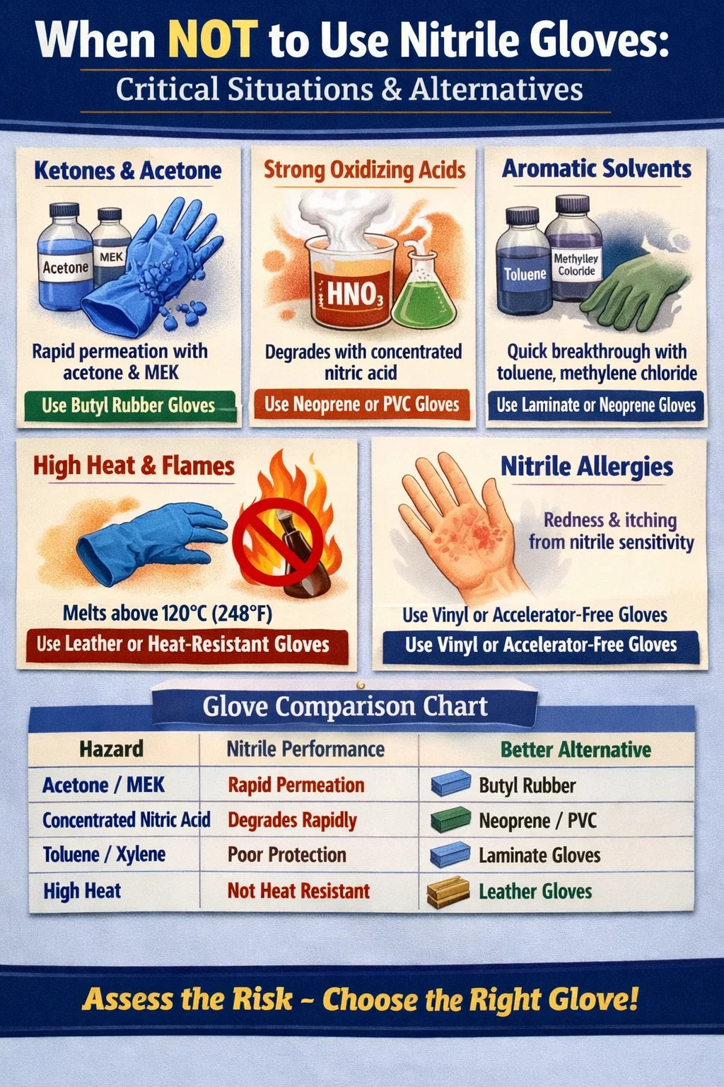 Brevis responsio: vitare chirothecas nitriles cum ketones quaedam tractantes, acida oxidentia valida, vel menstruata compacta; cum labore nimio aut flammas apertas; si subtilis dexteritas tangendi critica est, et opus diuturnitas brevis est; vel cum induto earum sensitivum nitrile documentum habet. Legitur in plena naufragii.