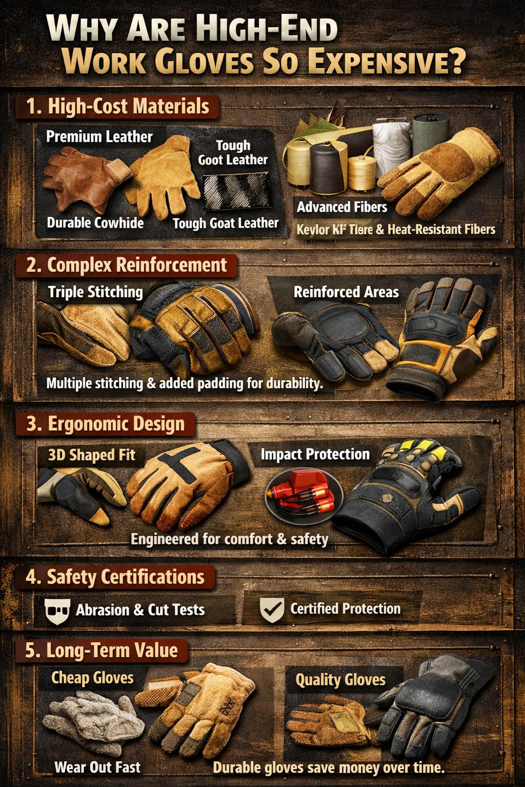 Par chirothecae vilis, quae paucis dollariis mercatus est, foramen unum post opus unius diei capere potest, cogens te assidue supplementum emere. Sed par summus qualitas operis chirothecae quae per sex menses durat ut minus per diem quam vilis emoluatur. Hoc longum tempus pretii ex diuturnitate est alia ratio ad premium pretium.
